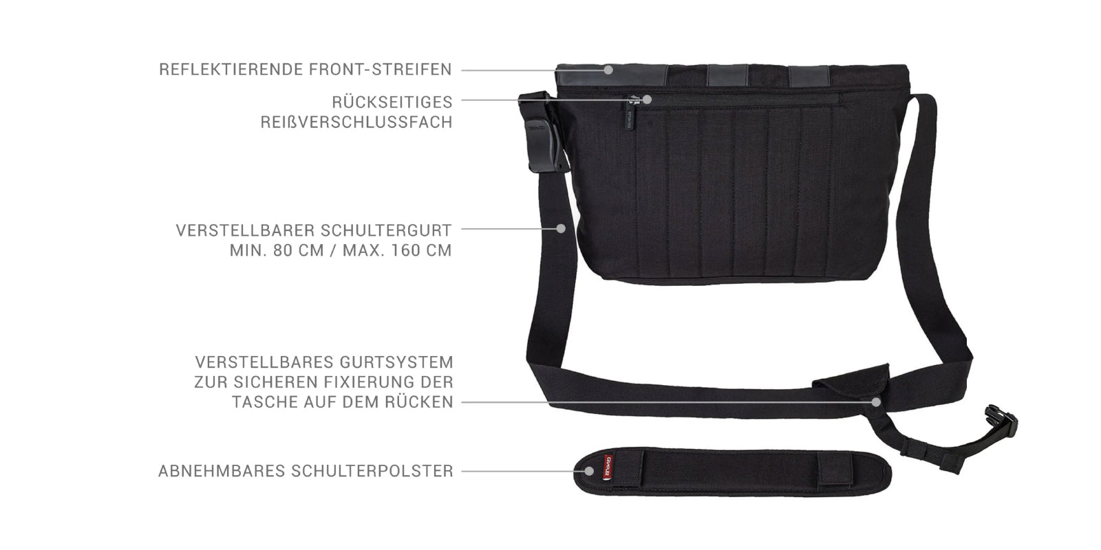 This messenger bag is made for life: to wear, to show and to be seen. With its colourful accents, the individual personalization option and the retro-reflective elements incorporated into the recycled outer material, it is the perfect everyday companion with enough space for a laptop and much more.