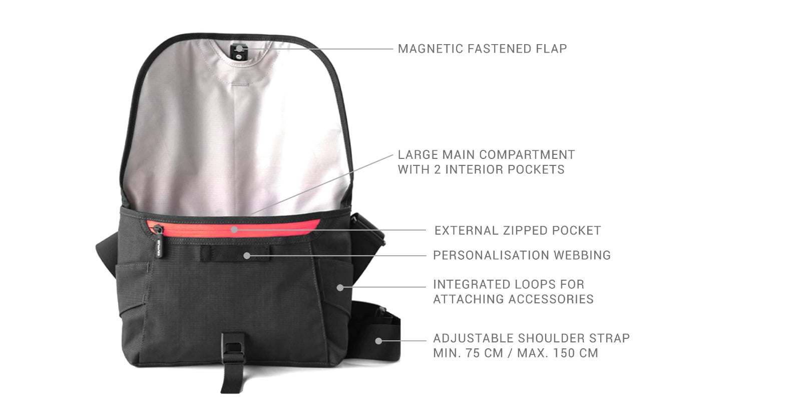 - Shoulder strap: 75 - 150 cm