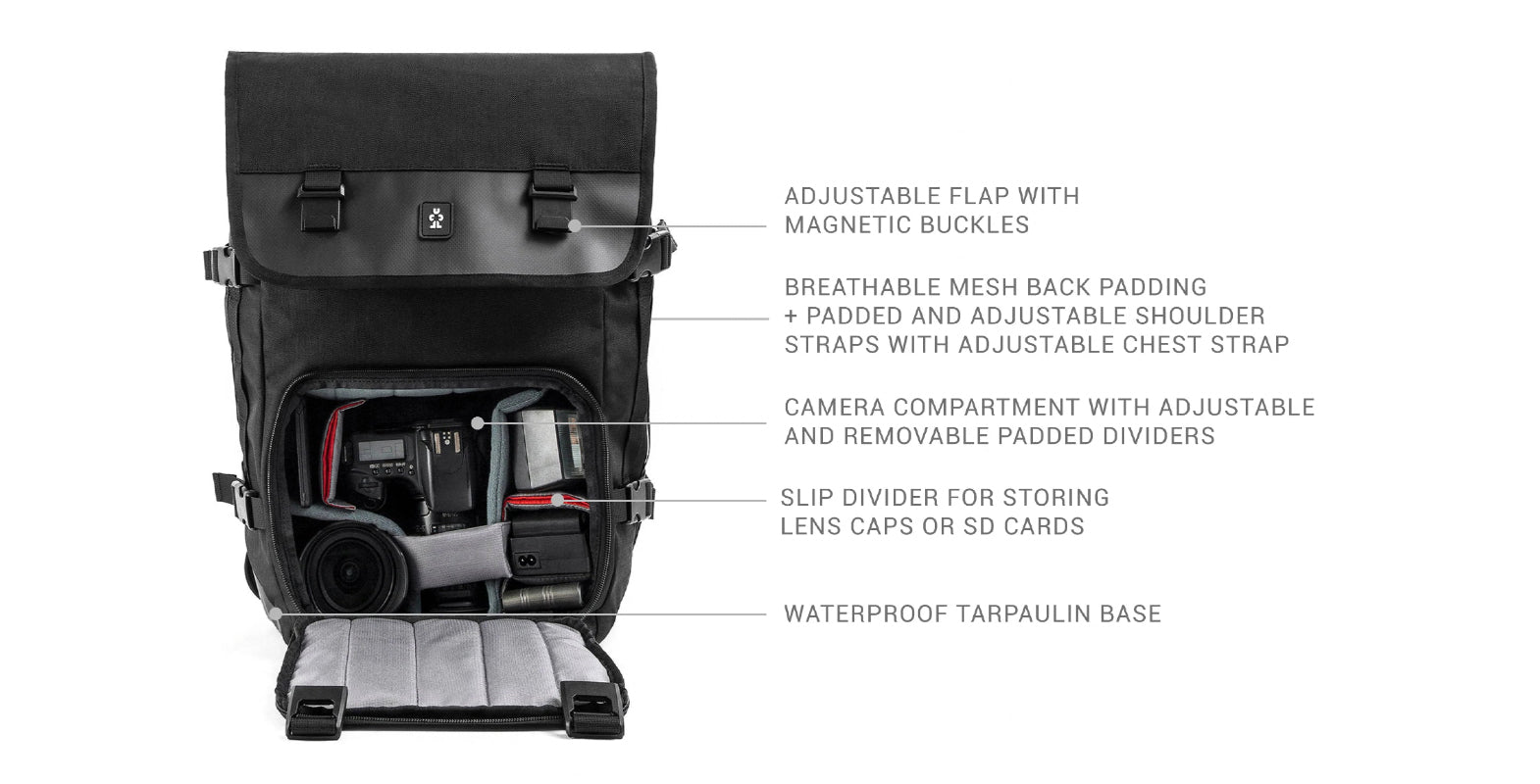 - Camera compartment: 34.0 x 21.0 x 13.0 cm